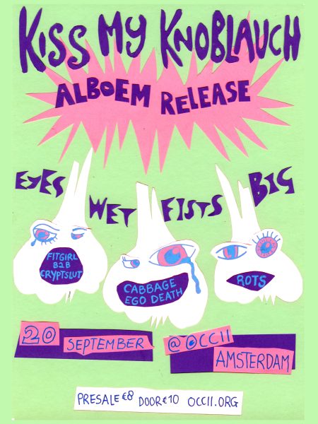 EYES WET FISTS BIG – Alboem release Kiss My Knoblauch cordially invites you to join in the celebration of the birth of the first alboem: Eyes Wet Fists Big. On this tasty night you will be bemused and amused by Rots, Cabbage Ego Death (BE) and DJduo Fitgirl & Cryptslut. KMK will play their album…
