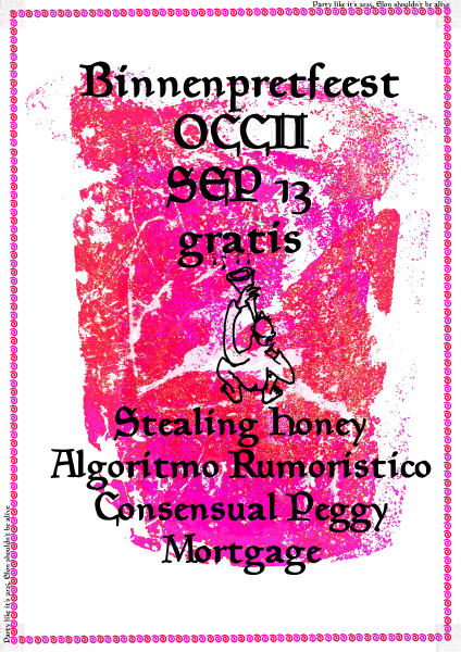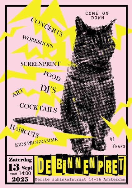 YEARLY CELEBRATION OF THE BINNENPRET COLLECTIVE – 41 YEARS ALREADY!!! DURING THE DAY YOU CAN FOLLOW WORKSHOPS, SCREEN-PRINT, DRINK A COCKTAIL, GET SOME FOOD AND A HAIRCUT ALL ON THE SQUARE LOCATED IN THE BACK OF OCCII / NEXT TO MKZ. THERE WILL ALSO BE FUN ACTIVITIES FOR THE LITTLE ONES. In the evening we celebrate…
