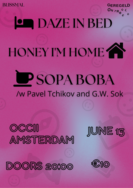 Blissmal presents Powered by Geregeld Ontregeld An evening shifting from dreamy to cathartic soundscapes. Sopa Boba combines modern classical strings, modular synths and spoken word. Daze In Bed crafts lush, melancholic dream pop and shoegaze. Honey I’m Home blends fuzzy shoegaze, emo and ‘90s alternative. Daze…